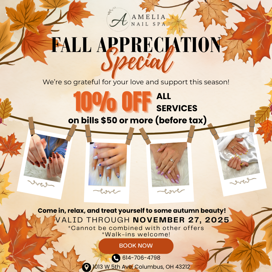 Come visit us at Amelia Nail Spa and let us bring out the beauty and confidence in you. Walk-ins are welcome, or call ahead to book your appointment today — we can’t wait to pamper you!